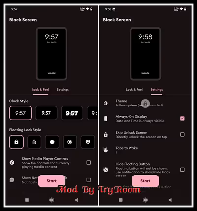 This helps save battery in AMOLED and OLED devices as the screen is completely off when displaying black color. Use the floating button to quickly turn off the screen and unlock it by tapping on it.