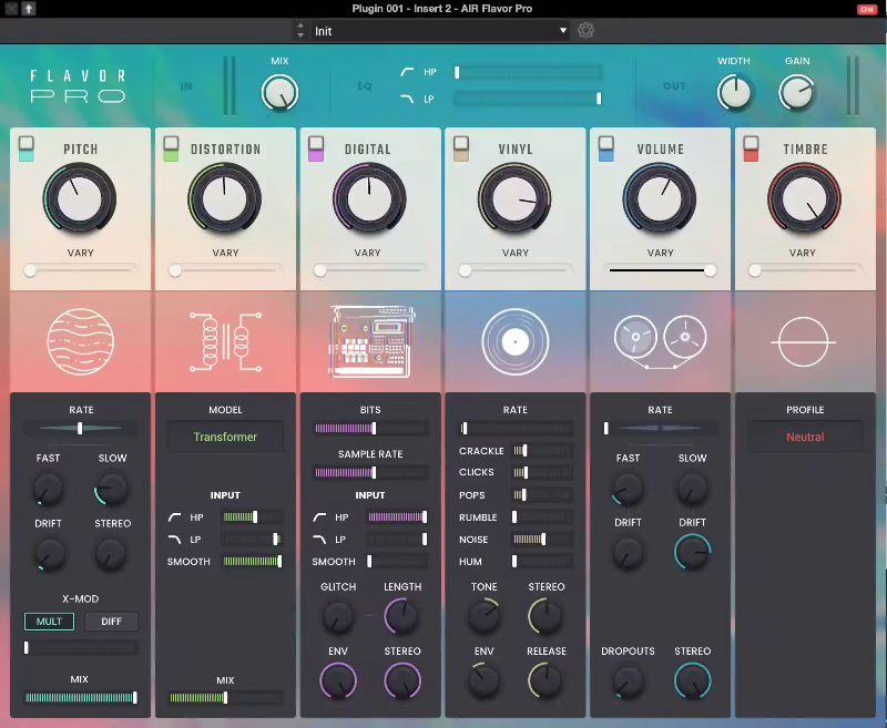 Add the vintage magical sound of analog saturation warmth, noise, and distortion. With nine models including Tube, Speaker, Vinyl, and Synth emulations, plus HP/LP Filter, Mix, and Vary Controls.