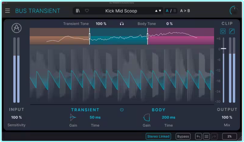 Bus TRANSIENT is a professional transient shaper designed to give you instant control over the attack and sustain of your sound. From tighter drums to punchier mixes, it delivers fast, musical results with an intuitive interface and clear visual feedback. Fine-tuned attack and body controls give you precise, instant punch and weight, with multi-band precision. Accentuate a snare, tighten boomy bass or add some body to a thin-sounding instrument. A built-in soft/hard clipper manages peaks and adds character. Keep your source loud without introducing unwanted harshness – adding warmth and saturation when driven.