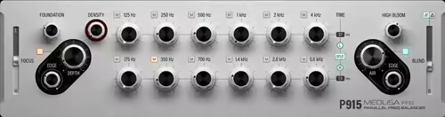 Enter the new reimagined P915 MEDUSA Fixed Filter Bank. A filter which adds subtle or not so subtle resonances to the signal or removing frequency bands altogether. This process, when mixed in with the unaltered, “dry” signal, can mimic the actual behavior of a traditional instrument. It can also act on its own as a unique and creative source of sound shaping possibilities not available in other filter structures.