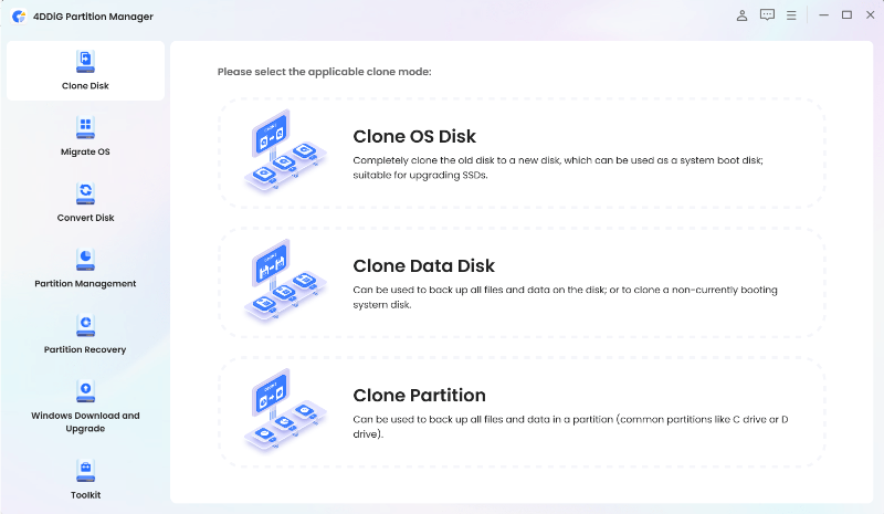 4DDiG Partition Manager allows users to clone partitions or entire disks, facilitating hassle-free system migration and backup. This feature ensures data integrity and minimizes downtime when transferring data to a new disk or safeguarding crucial information.