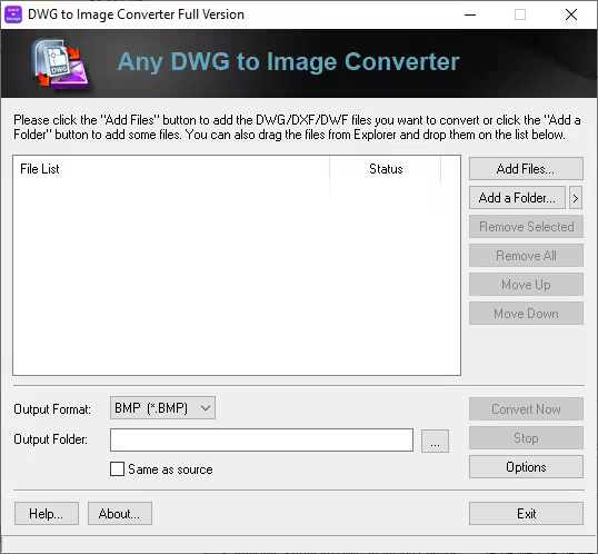 DWG to Image Converter allows you to batch convert DWG to TIF(TIFF)/JPG(JPEG)/BMP/PNG/GIF/PCX/WMF/EMF without the need of AutoCAD. It also batch converts DXF/DWF/DWFX to image format.