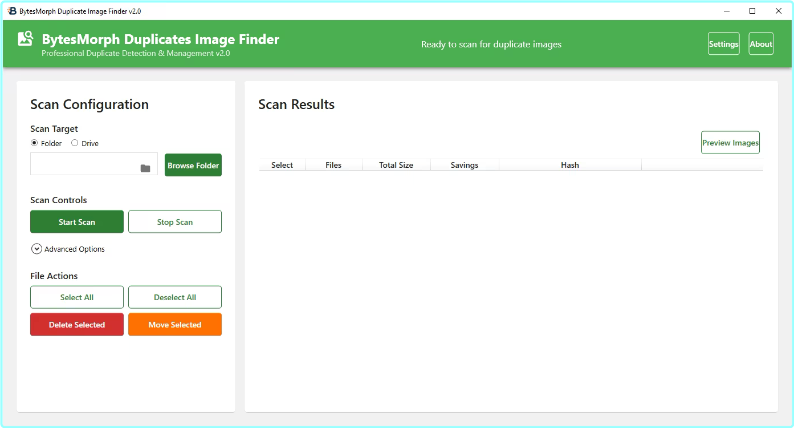 BytesMorph Duplicates Image Finder is an enterprise-level Windows application designed to help you reclaim valuable storage space by efficiently finding and managing duplicate images across your entire system. With its powerful scanning engine and intuitive interface, cleaning up your photo library has never been easier.