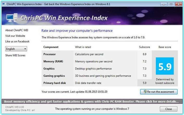 All in all, ChrisPC Win Experience Index can help you get an overall idea of your computer’s performance if you do not have the skills to run the assessment tool of the OS and discover the PC’s Windows Experience Index.