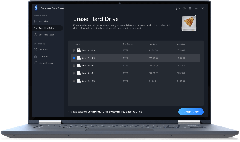 Don’t let your sensitive data fall into the wrong hands! Donemax Data Eraser is able to help you securely and permanently erase sensitive data before you sell, donate, trade in or lend your hard drive/external device to other people. The erased data will be gone forever, can’t be recovered by any data recovery method.