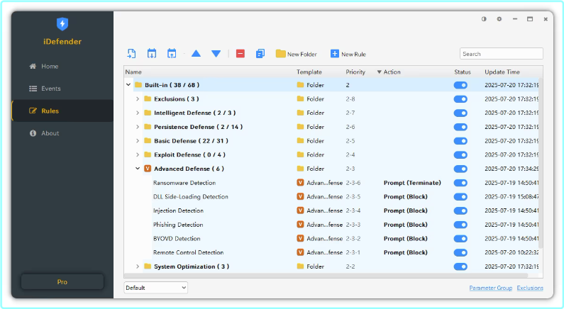 iDefender is a cutting-edge security solution designed for home use, offering both an Intrusion Prevention System (HIPS) and Real-time Endpoint Detection and Response (EDR). This integrated system protects against potential threats, ensuring the safety and integrity of your devices by actively monitoring and responding to suspicious activities.