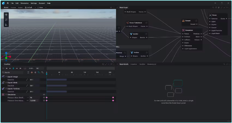 Liquid simulations have been notoriously difficult because of the knowledge required and the time and compute power needed. With an intuitive UI derived from EmberGen, you assemble a small node graph to create the perfect setup for your simulation. Press play, and tweak parameters in real-time. When you’re ready to export, simply click export and you’re done!