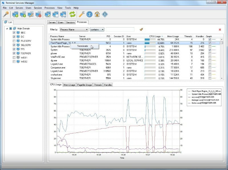 This program shows which user is connected to the remote host, what processes they are running, and how many server resources (CPU and memory) they use. You can send users messages, disconnect them from the server, or connect to their sessions remotely.
