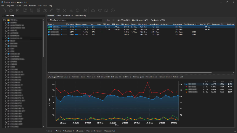 📝 DESCRIPTION: Terminal Services Manager connects to one or more RDS servers and shows all sessions, users, and processes in one place. You get CPU, memory, and 11 additional server metrics on interactive charts with zoom, pan, and measurement. The legend shows min, max, average, and current values in real time.