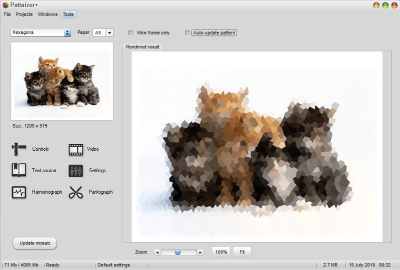 It is a versatile pattern creator featuring 22 unique approaches. It includes brick, and Ministeck patterns can be made (mosaics), and it can create Lissajous patterns with Harmonograph and Pantograph geometries. Each pattern has several control parameters to create unique effects.