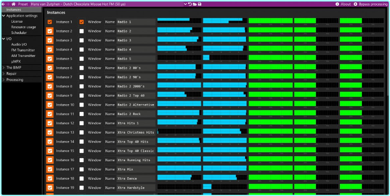 Thimeo ST-Enterprise is intended for larger media groups, which run multiple stations or channels. It does everything that Stereo Tool does, and more! With ST-Enterprise, you can run up to 50(*) FM and/or HD processors on a single pc, with a single interface to control them and an overview screen that shows the status of all the incoming and outgoing signals.
