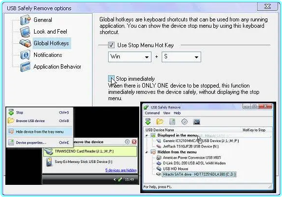 The program is an original and comfortable tool for safely removing a device or for finding out what devices are connected and for viewing the contents of their drives. Just move the mouse pointer over the tray icon of the program and you will see a multi-featured ‘quick stop’ menu with a list of devices
